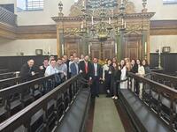 After this opening seminar, students had lunch with writer and journalist Dominic Green who shared his insights into the current political climate in Britain, America, and the world. This was followed by a tour of Bevis Marks synagogue, led by Rabbi Shalom Morris, the synagogue's rabbi. Bevis Marks is the oldest synagogue in England and the longest continuously running synagogue in the world. Rabbi Morris described the history of the Bevis Marks, its founding and the important role it played in Spanish Portuguese Jewish history. Rabbi Soloveichik then followed with a brief lecture about the synagogue's most famous member, Moses Montefiore, the Jewish philanthropist who is known for his early investment in Jewish settlement in the land of Israel. His seat in Bevis Marks is still sectioned off to this day.